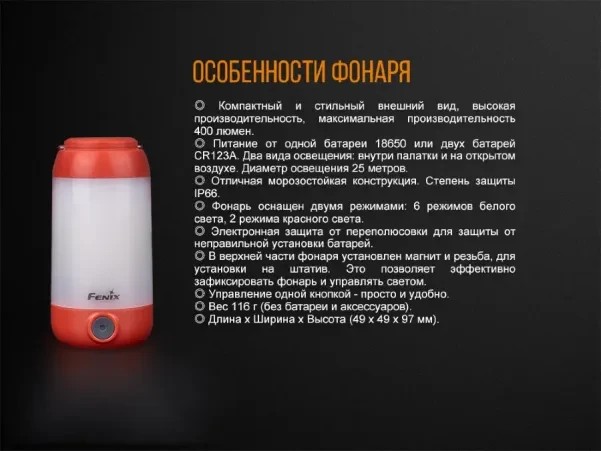 Фонарь Fenix CL26R специально создан для качественного освещения в туристическом лагере и внутри палатки. его максимальная яркость достигает 400 люмен. Фонарь работает от аккумулятора 18650 или же устойчивых к морозу литиевых батареек. Он отличается большой ударопрочностью, хорошей защищенностью от пыли и дождя. Эта модель хорошо себя показала в любых туристических целях, в том числе она подходит рыбакам и охотникам. Эта модель хорошо себя показала в любых туристических целях, в том числе она подходит рыбакам и охотникам.